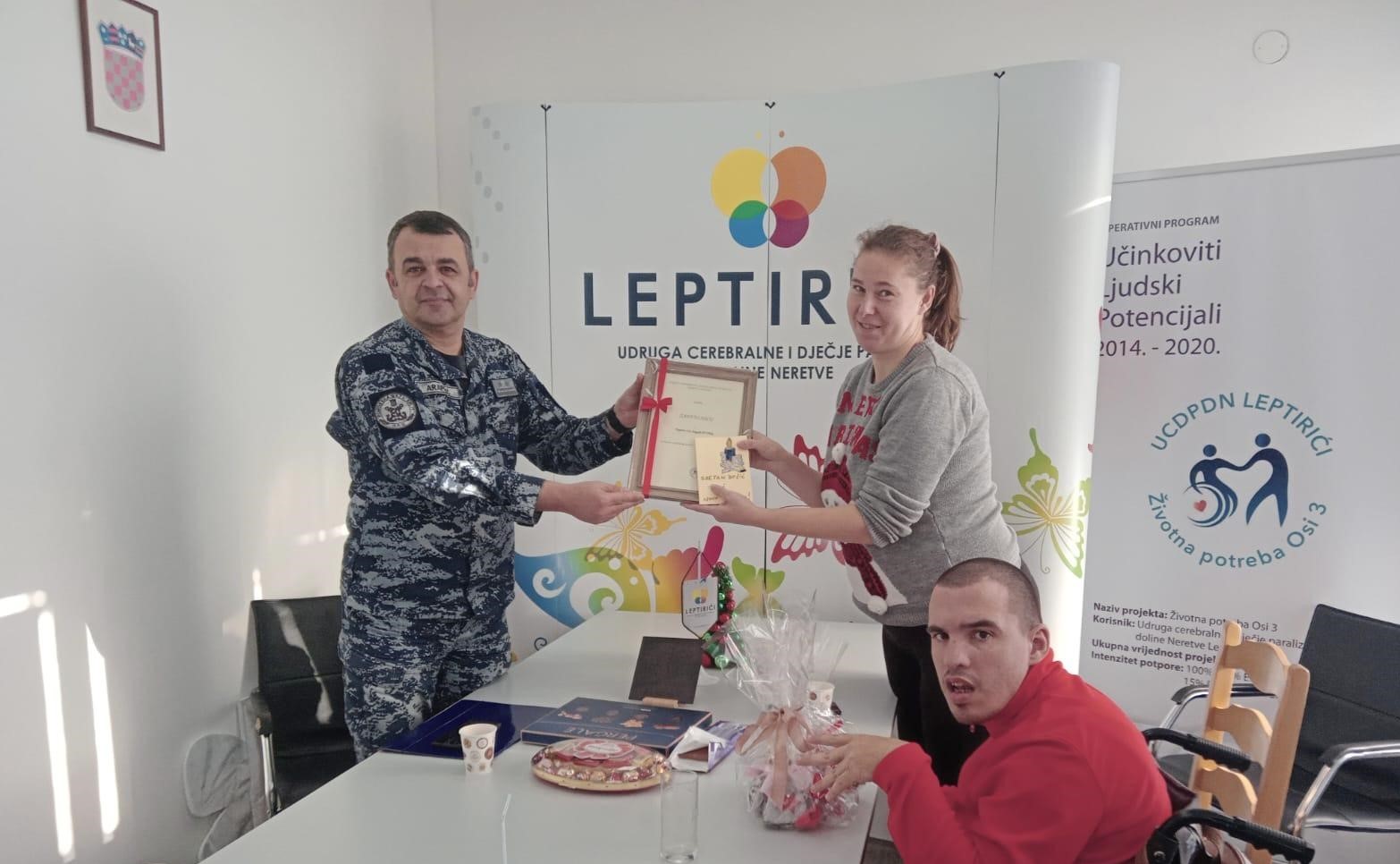 Pripadnici 116. brigade iz Ploča imali su saznanja o postojanju Udruge Leptirići, nakon čega su putem interneta i dobivenog materijala e-mailom došli do šire spoznaje o radu naše Udruge. Zapovjednik vojarne 116. brigade HV-a, pukovnik Darko Arapović, jučer je posjetio Kabinet za terapije. Upoznao je članove i predsjednicu Udruge Ivanu Nikolac, družio se i prošetao prostorijama u kojima pružamo sve bitne terapije djeci s teškoćama i osobama s invaliditetom. Ostavio nas je u ugodnom raspoloženju kad je istaknuo da je većina djelatnika, koji su sudjelovali u prikupljanju novčanih priloga, imala riječi hvale za akciju koja je organizirana. Izuzetno mu je drago što smo se upoznali te vidi mogućnost suradnje u humanitarnim akcijama koje će se u budućnosti organizirati u vrijeme božićnih i novogodišnjih blagdana. Riječ je o vrhunskoj postrojbi koja je primjer reda, rada i discipline uokvirenih velikim srcem jer ovo nije njihovo prvo hvalevrijedno iskustvo. Osobno su pukovnika Darku Arapovića darivali malim znakom pažnje, zahvalnicom i božićnim ukrasima koje su njihovih ruku djelo, naši članovi Josipa Gujinović i Vlaho Kuzman. Zadovoljstvo je bilo obostrano.