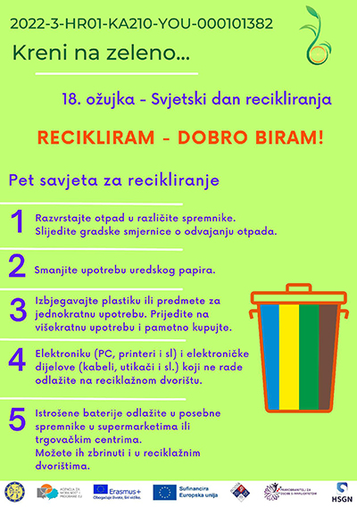 Povodom 18. ožujka – Svjetskog dana recikliranja SOIH u okviru Erasmus + projekta “Kreni na zeleno” u partnerstvu s Nacionalnom organizacijom osoba sa invaliditetom Srbije (NOOIS), Pravobraniteljice za osobe s invaliditetom (POSI) i Hrvatskim savezom gluhih i nagluhih (HSGN) želi ukazati na značaj recikliranja i potaknuti saveze i udruge osoba s invaliditetom, kao i same osobe s invaliditetom na svakodnevno savjesno djelovanje u cilju očuvanja našeg planeta.